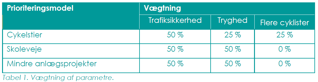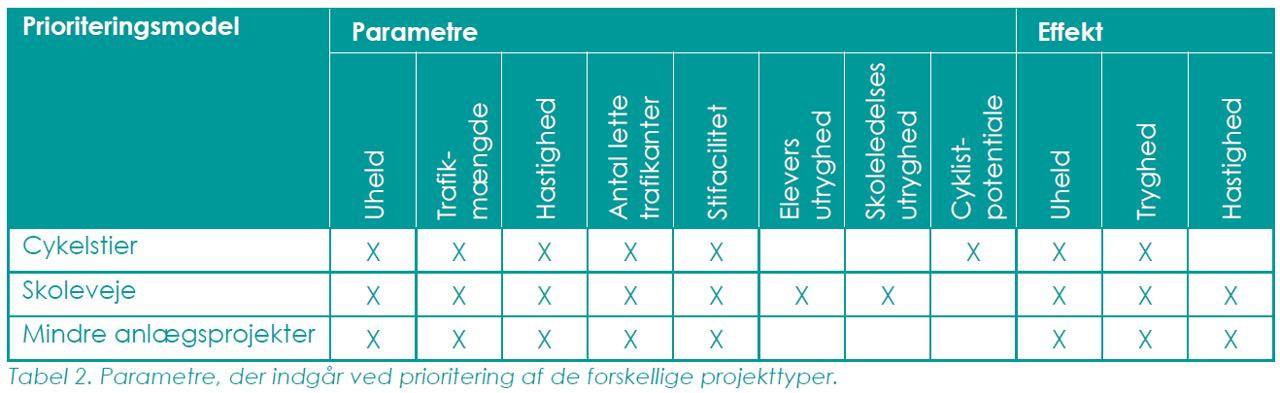 Prioriteringsmodellerne for henholdsvis mindre anlægsprojekter, cykelstier og skolevejsprojekter baserer sig på såkaldte multikriterieanalyser, hvor udvalgte hensyn (parametre) vægtes i forhold til hinanden ud fra forholdet mellem effekt og økonomi. Modellerne sikrer, at de projekter, der har den største effekt og de laveste omkostninger, prioriteres højest. Tabellerne nedenfor viser en oversigt over vægtning af parametre og hvilke parametre, der indgår i de tre modeller.