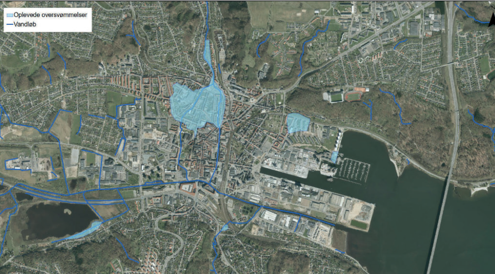 Vandet omgiver nemlig Vejle midtby fra stort set alle sider. Vi har vand i fjorden, et grundvandsspejl, der ligger højt, vand fra vandløb og åer og øgede mængder af regn, der strømmer ned ad Vejles stejle bakker og giver udfordringer i midtbyen.