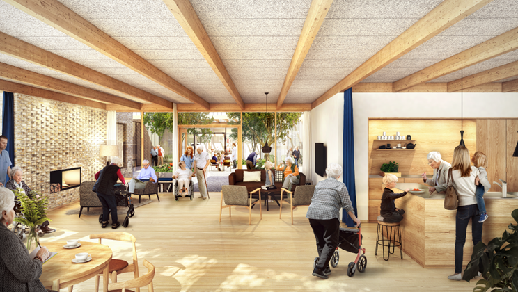 I tæt tilknytning til plejecentret placeres daginstitutionen med plads til børnehave- og vuggestuebørn, og midt i det hele – institutionens hjerte – placeres et fællesareal. Her vil der blandt andet være en sal, hvor man se film og lave gymnastik, en sanse- og velværesalon og et pædagogisk køkken, hvor børn og ældre sammen kan lave mad.