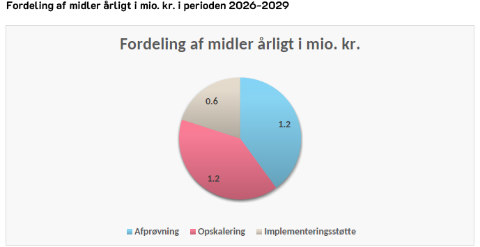 I puljen sættes der 1,2 mio. kr. af årligt til afprøvning af velfærdsteknologi. Der er sat 1,2 mio. kr. af årligt til opskalering. Der er sat 0,6 mio. kr af årligt til implementeringsstøtte.