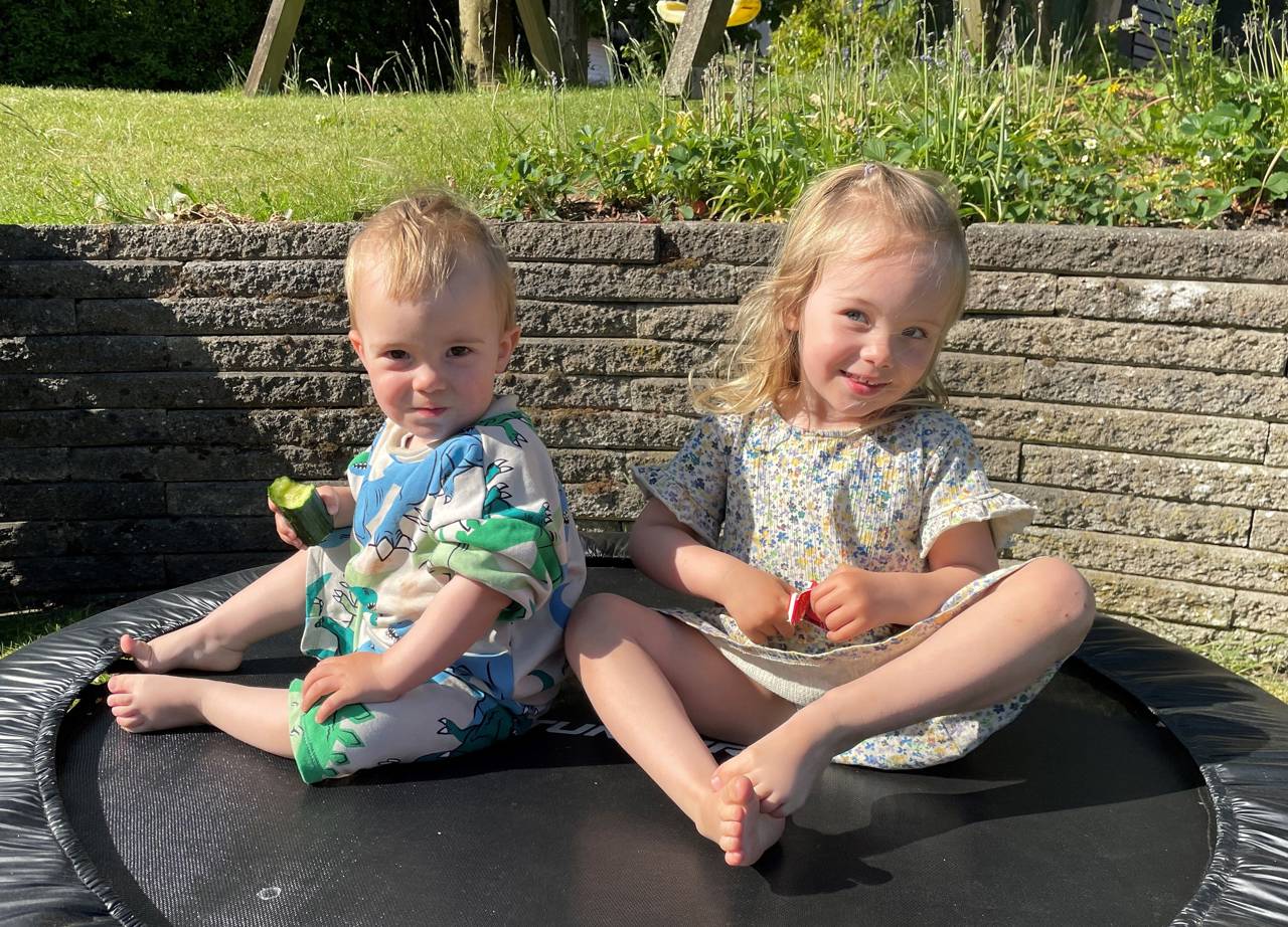 Esther og August har indtaget haven, hvor der er både gynger, trampolin og masser af græs at løbe på.