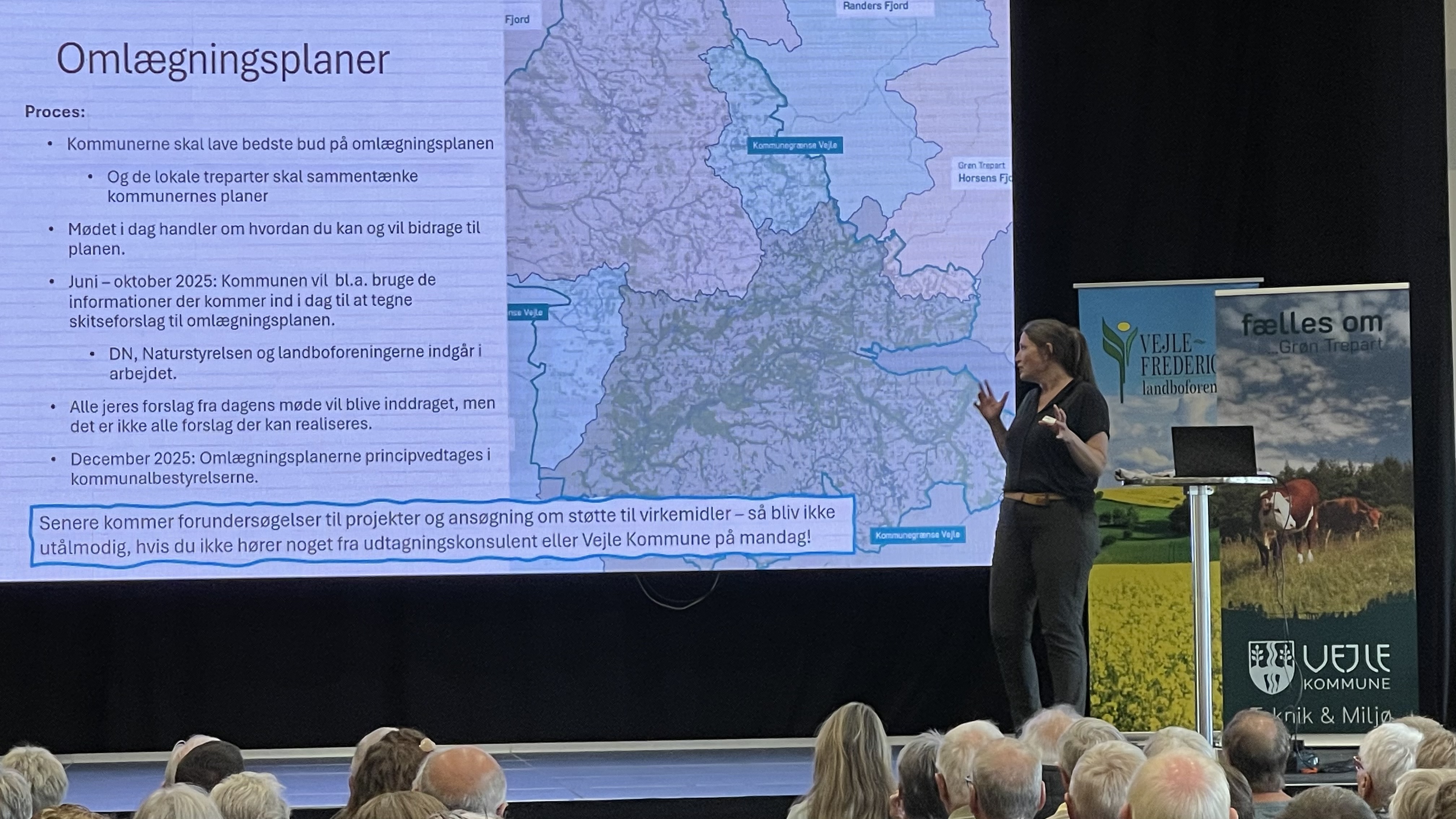 Opfordringen fra arrangørerne af lodsejermøderne – de lokale landbrugsorganisationer og Vejle Kommune – lød, at vi klogt og i fællesskab skal løse de mange udfordringer med en af Danmarkshistoriens største arealomlægninger. Vi skal sammen skabe synergier mellem indsatser, der løser flere mål, når vi skal reducere CO2 udslip, kvælstof samt klimasikre og skabe mere natur.
