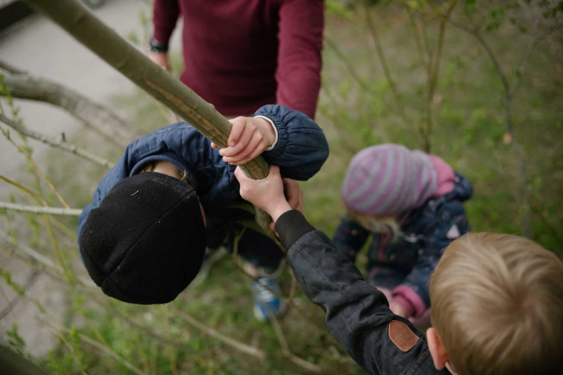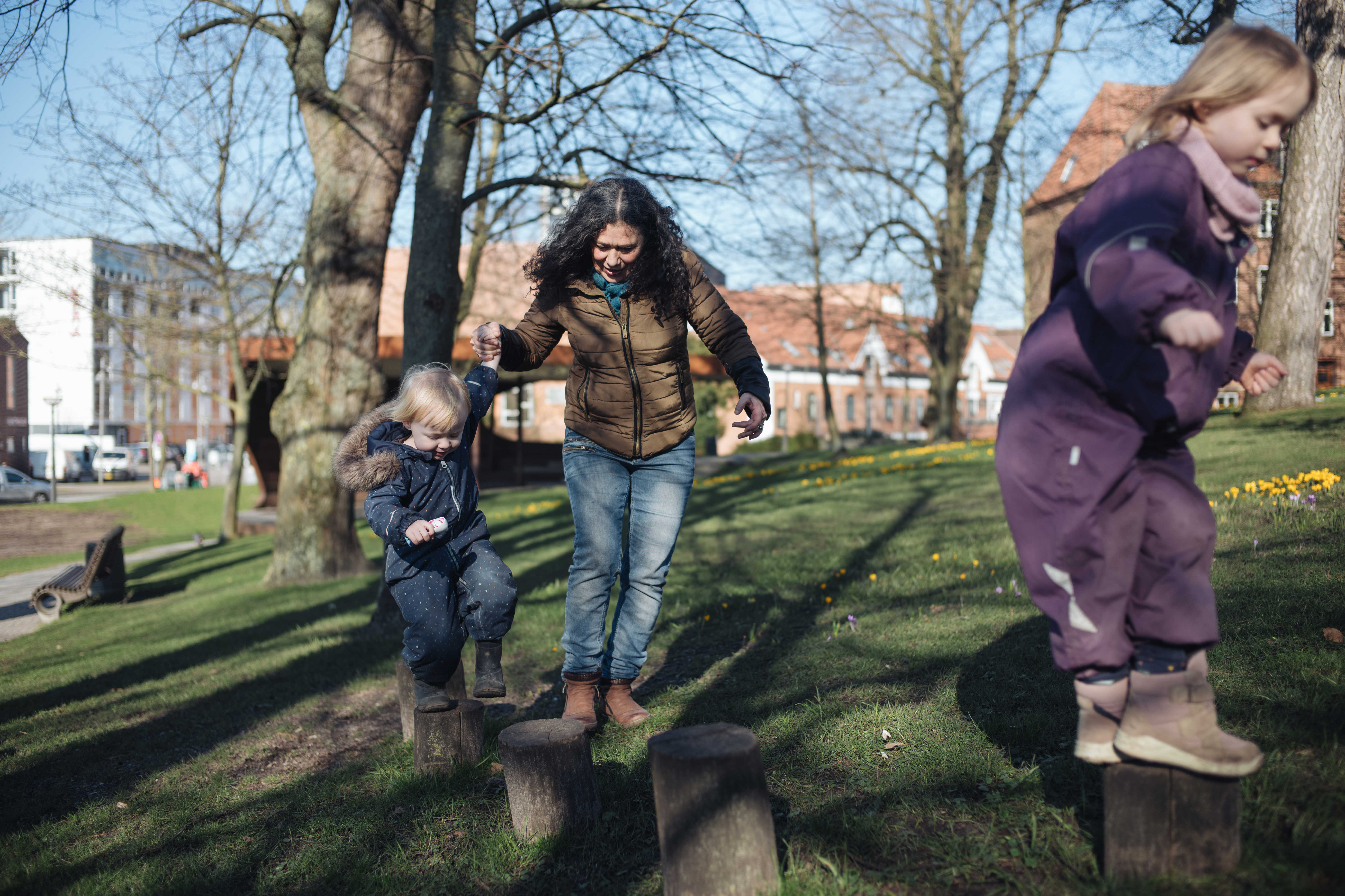 Tre børn kommer pædagog Mie i møde på legepladsen i børnehusene Vindmøllen i Vejle. De hopper op i den store sanserede, og Mie sætter gyngen i bevægelse med et skub. Børnene ler, solen skinner, og overalt pibler foråret frem på legepladsen.