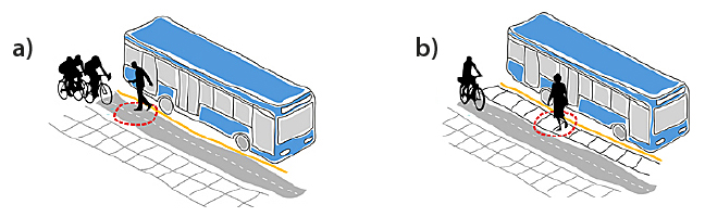 b) When the bus stops at a small bus island between the road and the bike lane: Continue driving but slow down a bit and pay attention to the bus passengers on the bus island and on the sidewalk, in case somebody steps out in front of you.