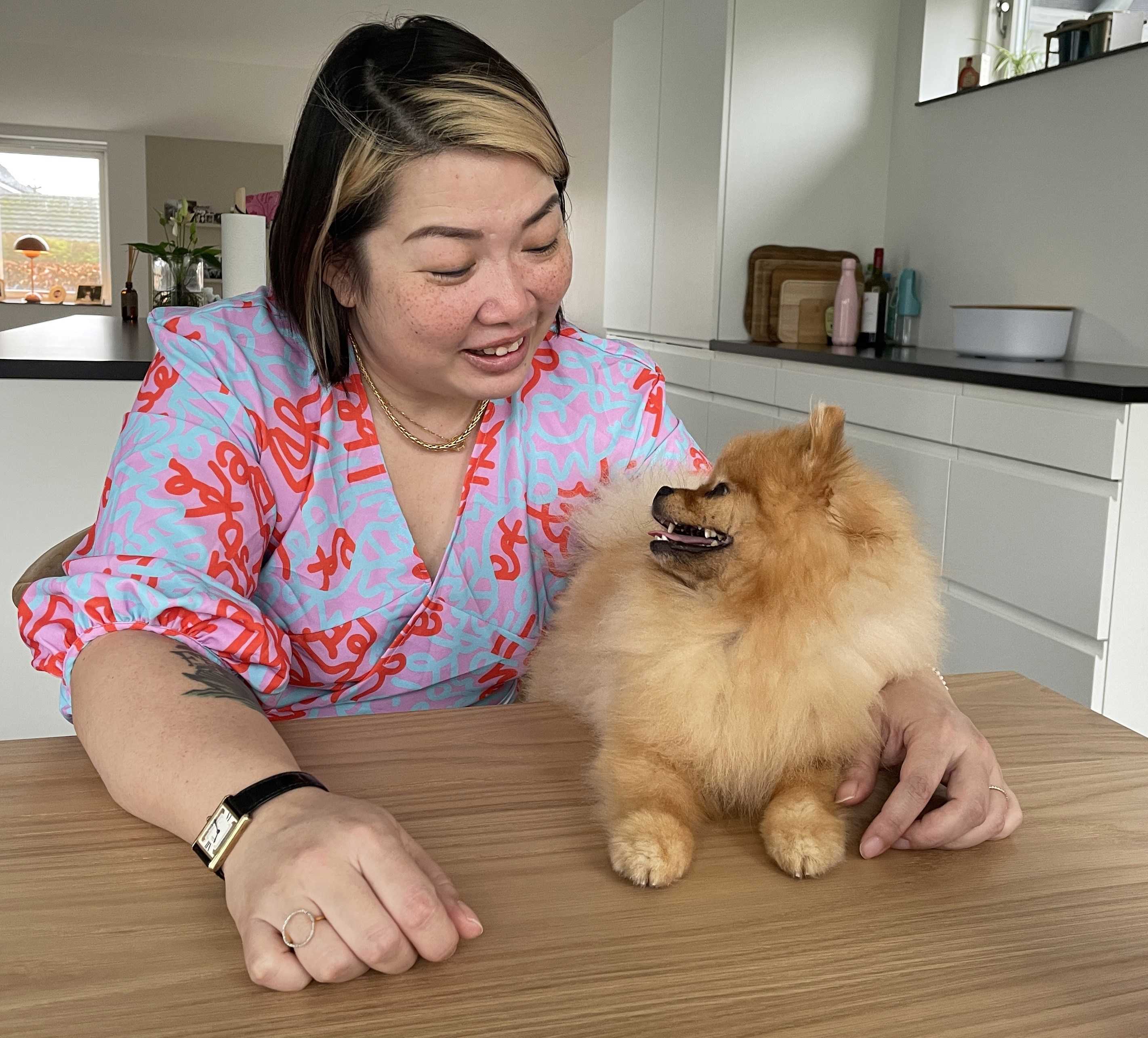 “We went for a walk in the area and suddenly we were standing in front of Vejle Windmill. It was just so idyllic. And the pedestrian street..! Wow, it was like it was taken out of a history book with the old buildings. Everything was so ‘cute’,” she says emphatically, while hugging an attention-seeking Mr. Fong. She then lays the little dog on the light oak table and buries her hands in his caramel-coloured fur.