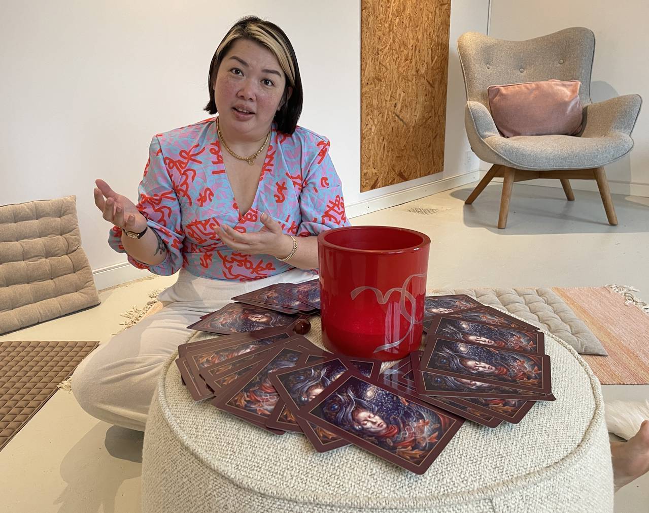 Five steps from June’s terrace door lies the extension with her furnished workspace. She works as a coach and reiki healer, helping people with different challenges in life.