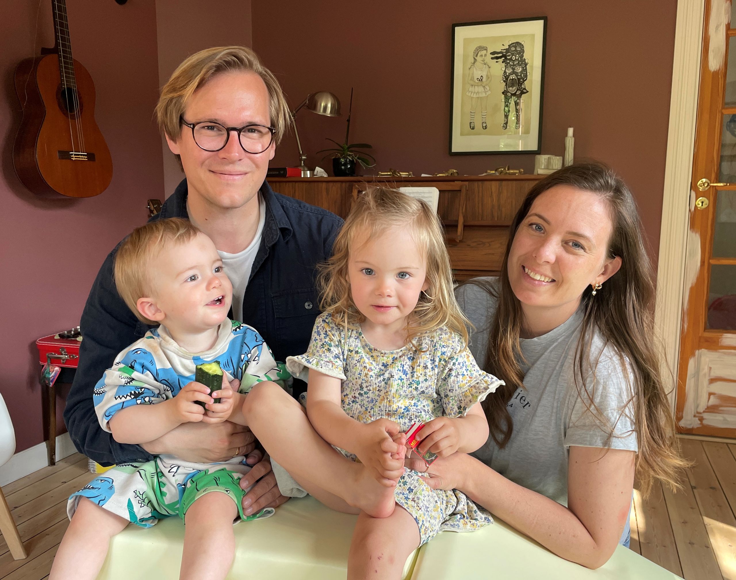 He and Katrine sit at the long table in the middle of the three connecting rooms, which are painted different colours to give them each their own style. Their children, August and Esther, sit in their high chairs eating rye bread and mackerel. Various toys are spread across the floor, while in one of the rooms a cartoon movie is playing on a TV.